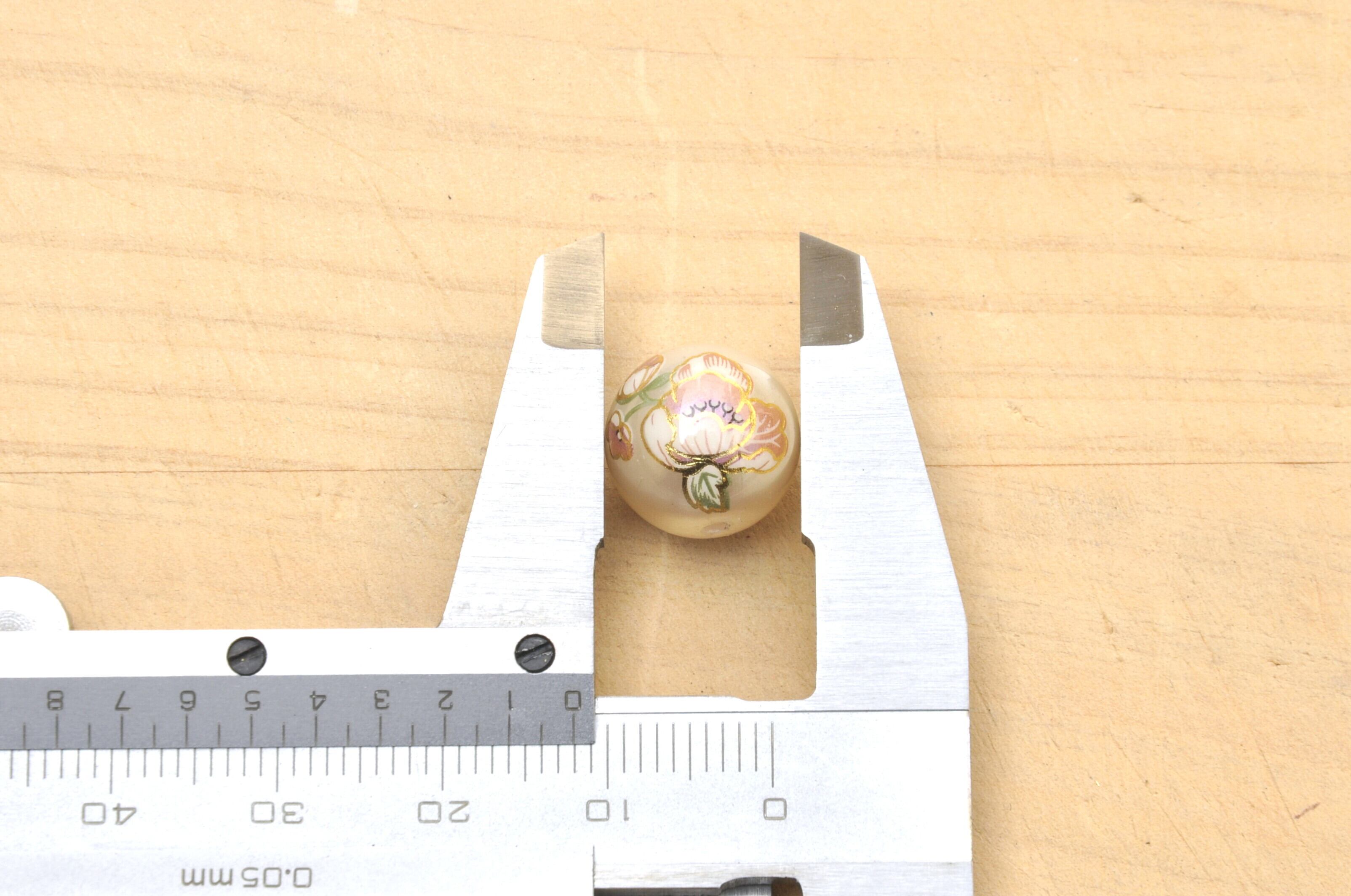 イミテーションパールのまるだまにロココの模様が入っています。所々が金色で縁取られています。